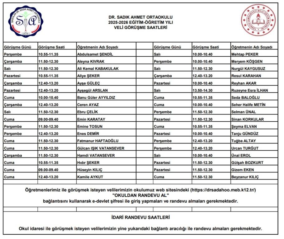 Veli görüşme saatlerimiz belirlendi. Velilerimizin web sitemiz üzerinden "OKULDAN RANDEVU AL" linkini kullanarak e-devlet şifreleri ile görüşmek istedikleri öğretmenimizden randevu almaları gerekmektedir.